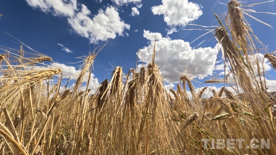 图为蓝天白云之下饱满的青稞迎来成熟 摄影:德吉卓玛