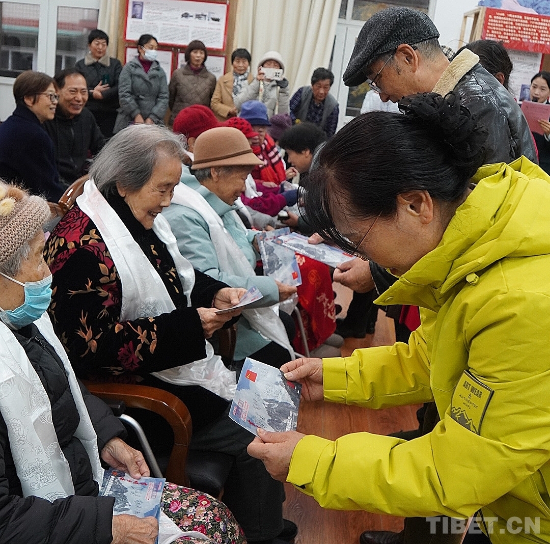 在热烈的掌声中,来自四川成都、双流、乐山、江油等地的十八军后代向首批进藏女兵敬献哈达。五位首批进藏女兵彭家英阿姨(97岁)、邵镜阿姨(95岁)、郭淑华阿姨(93岁)、董宏侠阿姨(98岁)、郭振华阿姨(95岁)向在蓉首批进藏女兵后代赠送了纪念邮简。