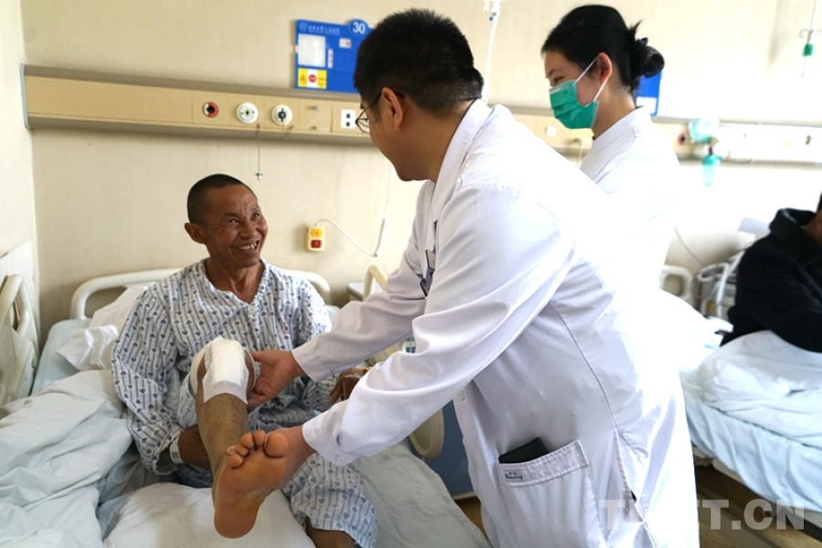 “现在感觉怎么样?”“这里疼不疼?”走进病房,北京大学人民医院骨关节科支部书记、主任医师李虎用藏语和患者扎西多吉进行着简单的术后恢复情况交流。从2017年7月至今,李虎已经赴藏21次,参与团队的大骨节病流调、筛查及手术治疗工作。在和当地群众的沟通中,已经掌握了一些简单的藏语。据李虎介绍,这次来京手术的,是大骨节病公益项目第十四批来自昌都洛隆的大骨节病患者,大部分是需要接受膝、髋关节置换手术的病人,也有一些情况相对复杂,需要做截骨矫形手术,比较特别的是有一位需要进行踝关节治疗的小朋友,“希望能像前面的十三批患者一样,取得很好的手术效果。”