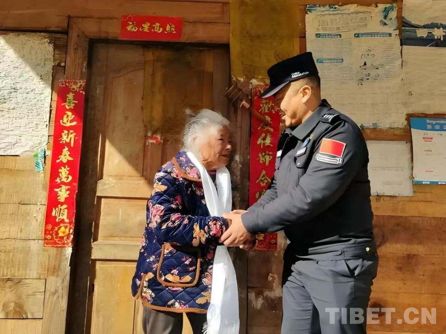 图为2023年,竹瓦根边境派出所民警仁青达瓦在春节期间看望卓给老人