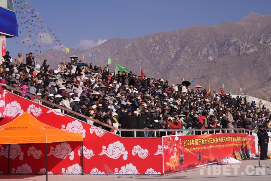中国西藏网讯 2月20日,拉萨北郊赛马场彩旗猎猎、人声鼎沸。2026年藏历新年初三民族传统马术表演暨民族赛马活动正式拉开帷幕。