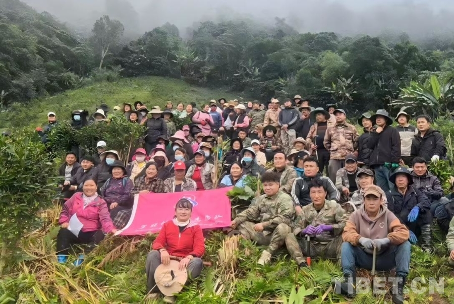 罗布央宗(第一排左一)在墨脱和乡亲们一同参与志愿活动 受访者供图