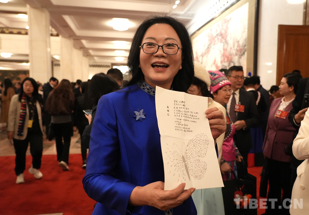 全国人大代表、依文·中国坊创始人夏华向记者展示贵州绣娘写给她的感谢信