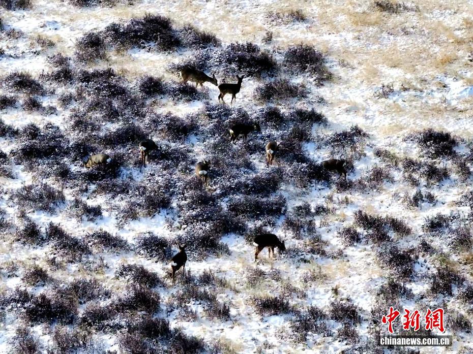图为野生动物在雪地里觅食。(无人机照片)仁青多杰 摄