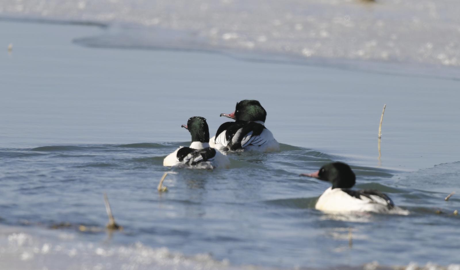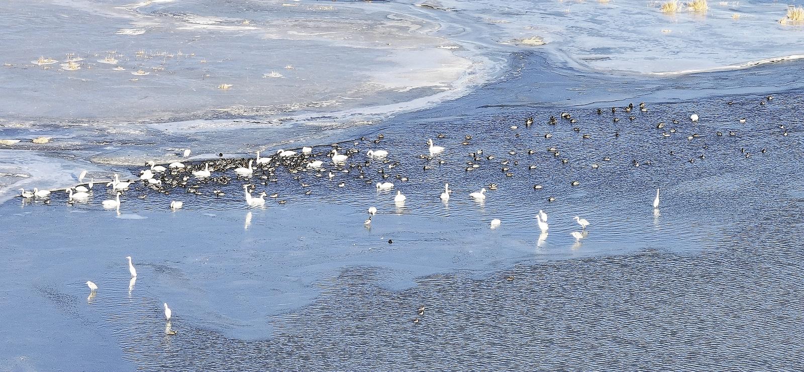 终于在一片冰原中央,发现了一小块没结冰的水域。这方小小的水面,成了水鸟难得的冬日栖息地,数十种水鸟在水里游曳、觅食,丝毫不受周遭寒风的影响,给这片沉寂的湿地添了几分生机。