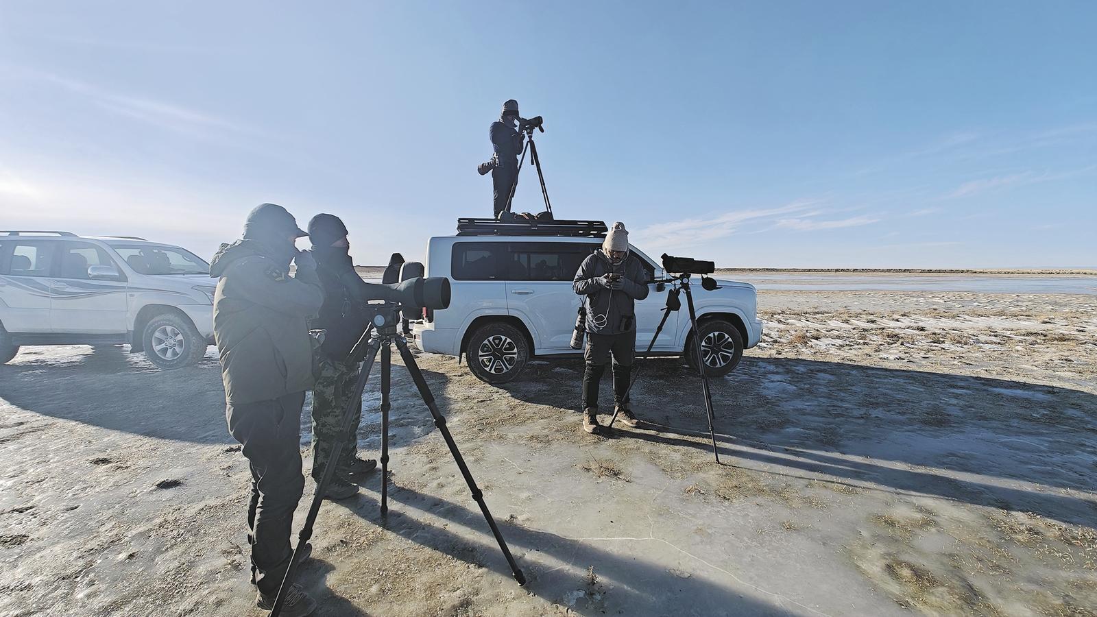 格尔木市监测收尾,顾不上吃饭,揣着点干粮就驱车赶往都兰县田格里湿地。这是海西组此次冬季水鸟调查的最后一站。同事回忆起2025年4月曾在这儿记录下万只灰鹤迁徙的画面,漫天灰鹤齐飞的场景,直到现在想起来仍觉得震撼。