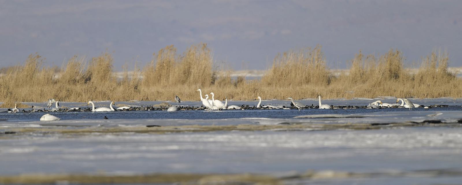 去年也曾参与监测的省林业和草原局工程师马存新盯着水面看了会,轻声说今年的水鸟看着比往年少些,估摸着是今年天冷,结冰的区域比往年大,水鸟的栖息空间被压缩了。