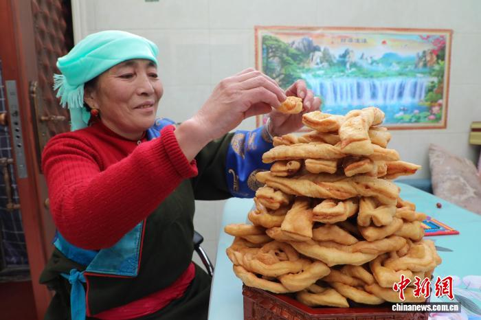 2月16日,中国农历除夕,卓玛措摆放“卡塞”(藏式点心)。中新社记者 马铭言 摄