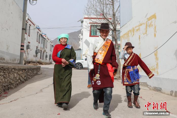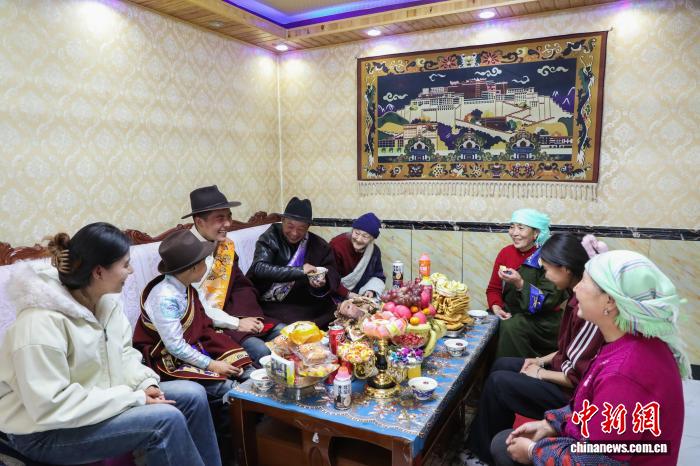 2月16日,中国农历除夕,卓玛措(右三)带着晚辈看望85岁老人安措杰(左五)一家。中新社记者 马铭言 摄