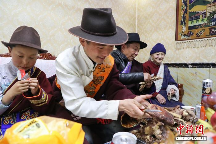 2月16日,中国农历除夕,拉毛扎西(左二)吃牦牛肉。中新社记者 马铭言 摄