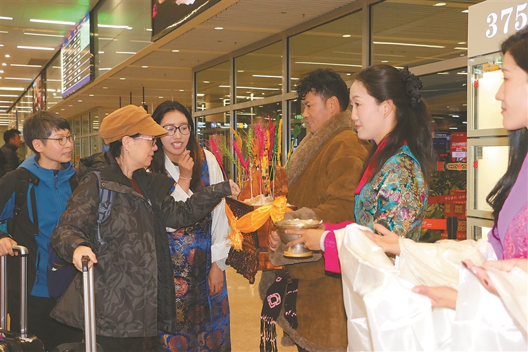 香港首趟旅游包机团抵达山南 歌声与哈达述说浓浓家国情