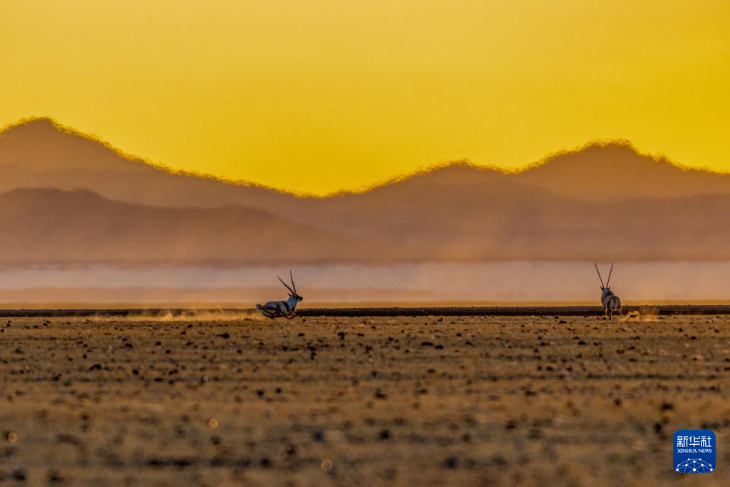 在阿尔金山国家级自然保护区,雄性藏羚羊(右)在追逐雌性藏羚羊(12月5日摄)。新华社记者 辛悦卫 摄