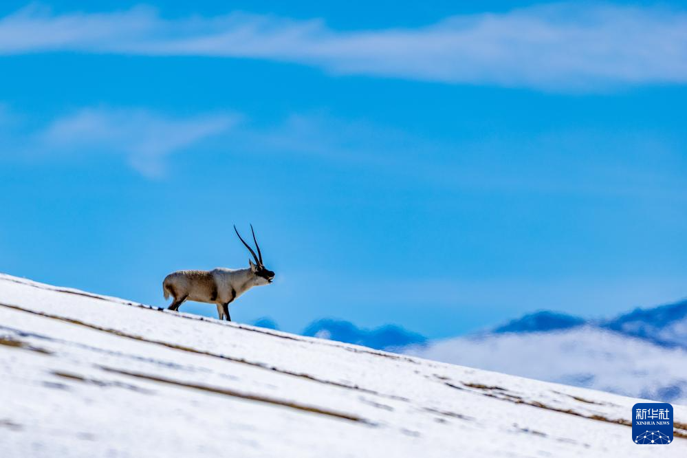 一头雄性藏羚羊在羌塘国家级自然保护区的雪原上嗥叫,呼唤伴侣,挑战对手(11月30日摄)。新华社记者 姜帆 摄