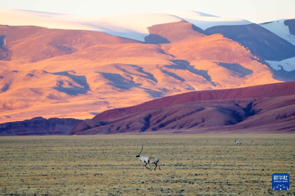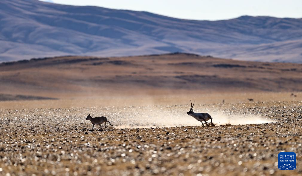 一头雄性藏羚羊在羌塘国家级自然保护区的草原上追逐雌性藏羚羊(12月1日摄)。新华社记者 郭昱 摄
