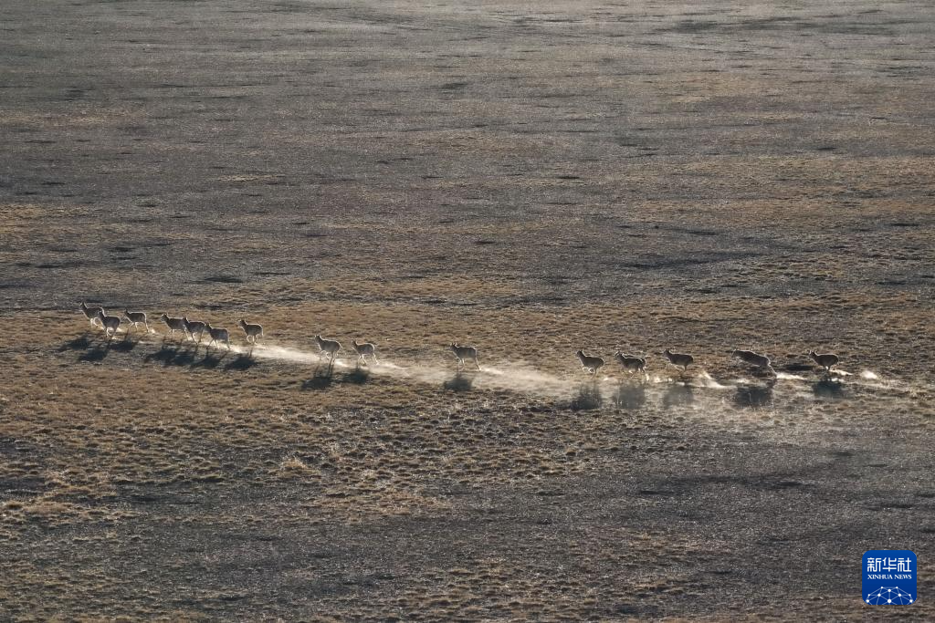 在阿尔金山国家级自然保护区,一群藏羚羊在草原上奔跑(无人机照片,12月7日摄)。新华社记者 辛悦卫 摄
